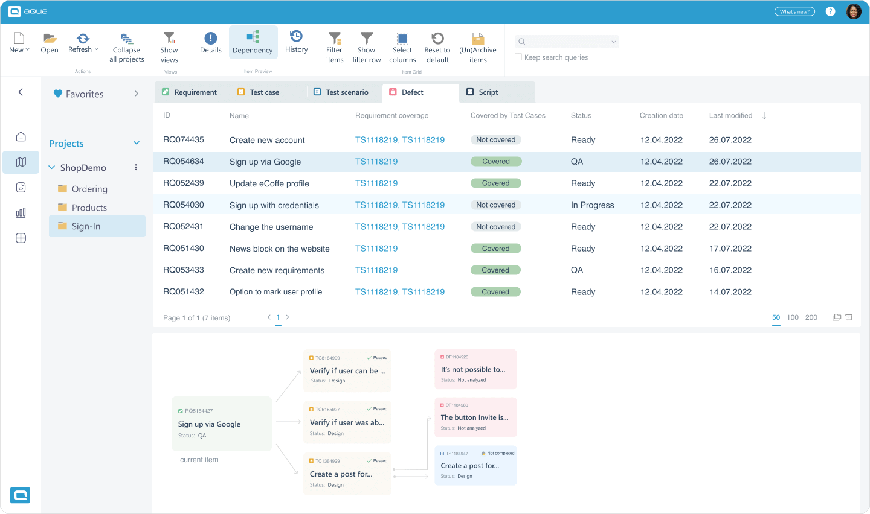 Use aqua’s requirements view to see requirements that are not covered by tests. Check if existing test cases are up-to-date in one click